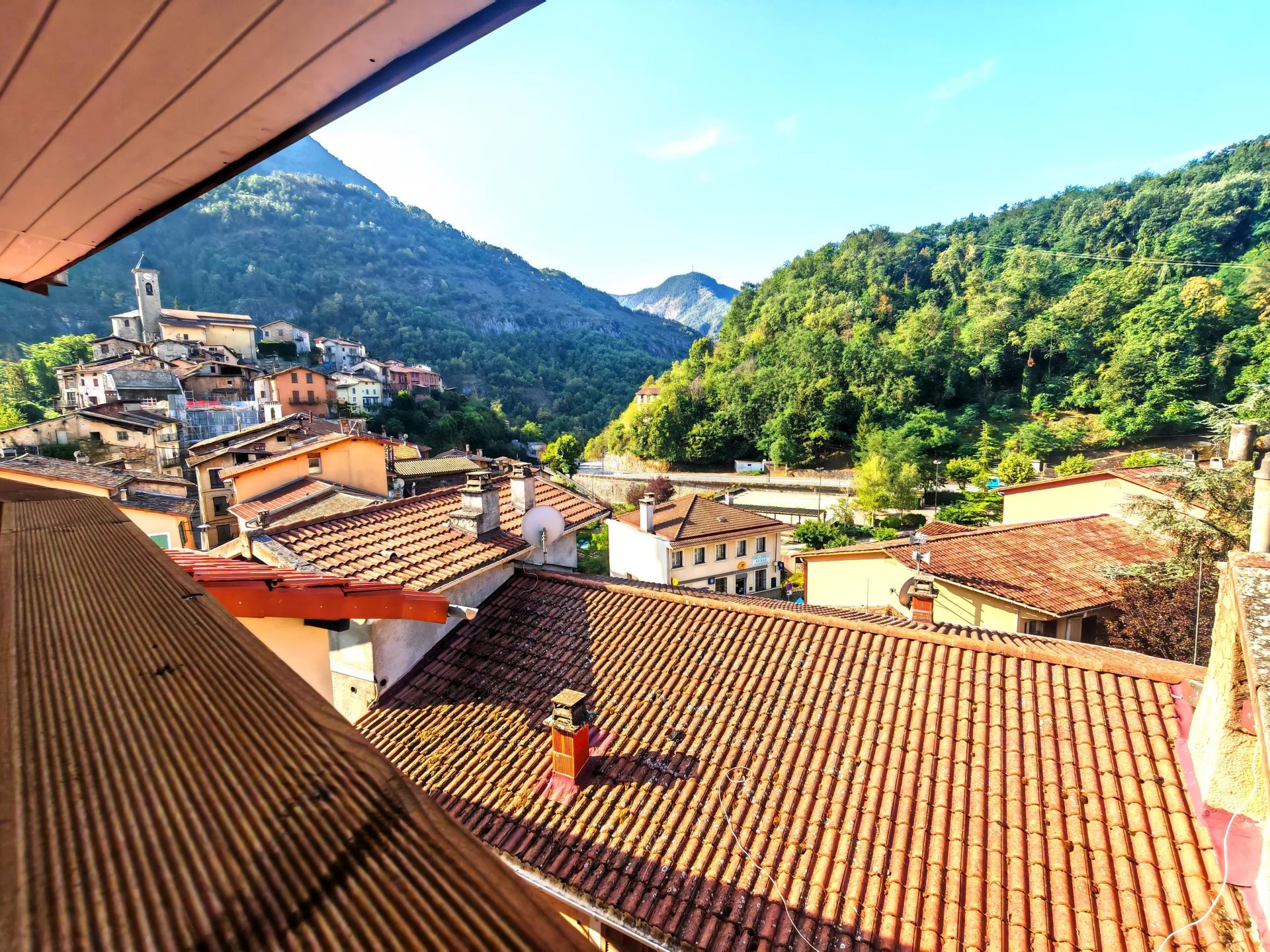 Vue sur le village et les montagnes, parkings et commerces à proximités