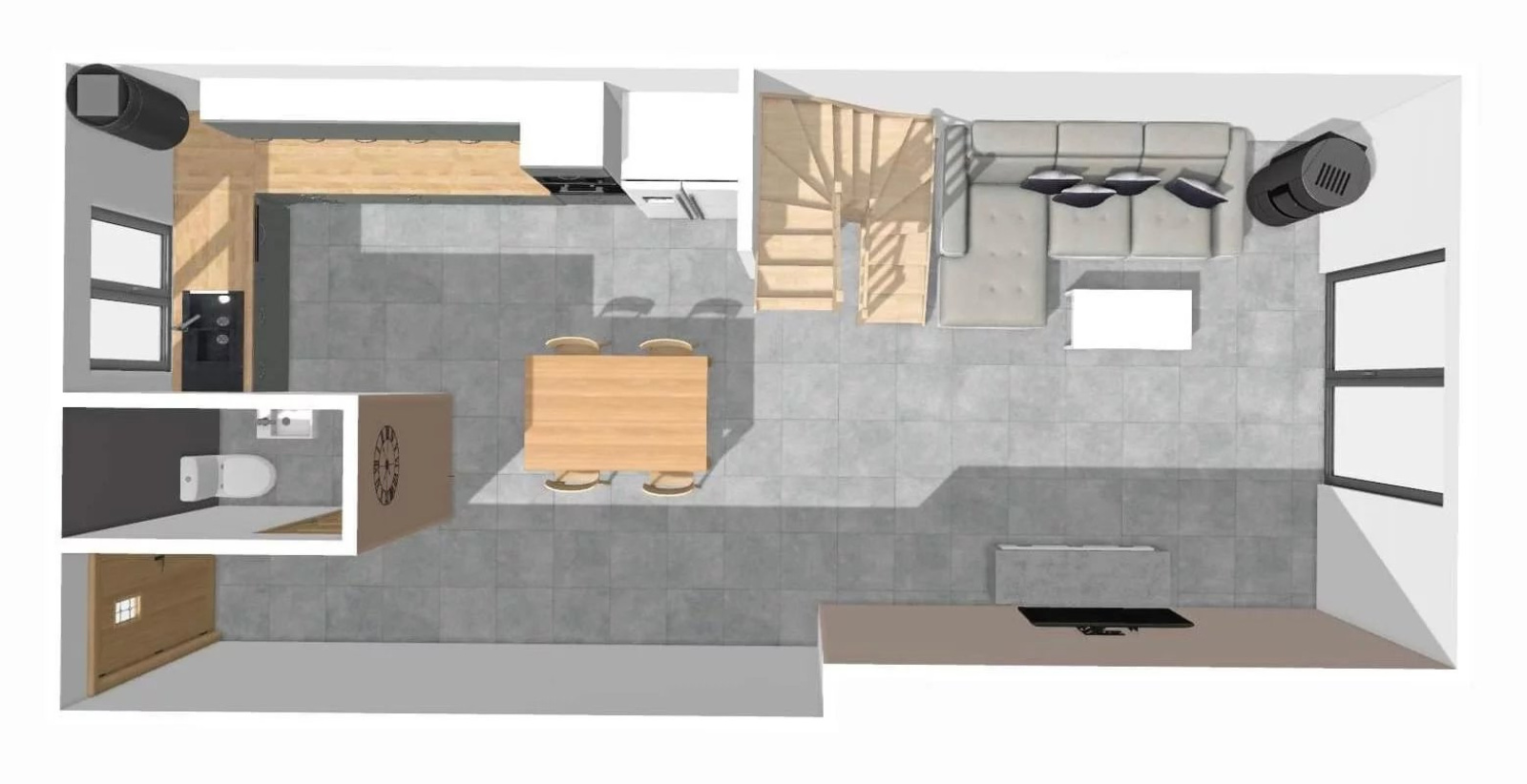 Rez de rue : une entrée, un séjour avec cuisine ouverte, balcon, wc