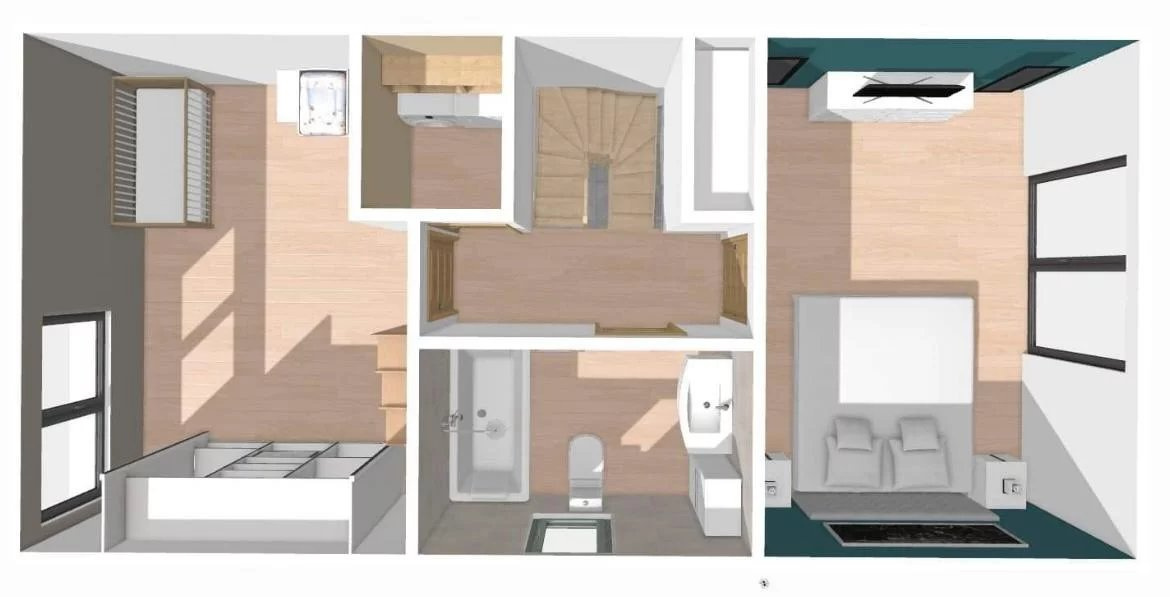 1er étage : 2 chambres dont une avec balcon, une salle de bain/wc, une buanderie